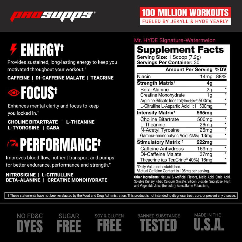 - Informed Choice Certified, Banned Substance Tested: Products that bear the Informed-Choice logo undergo rigorous routine testing and manufacturing audits and have been tested for more than 220 banned substances prohibited in sport by LGC’s world-class anti-doping labs. Athletes and fitness advocates can trust ProSupps Mr. Hyde Signature knowing they can train harder and longer, and that our products are not only effective, but certified for use in most sports.