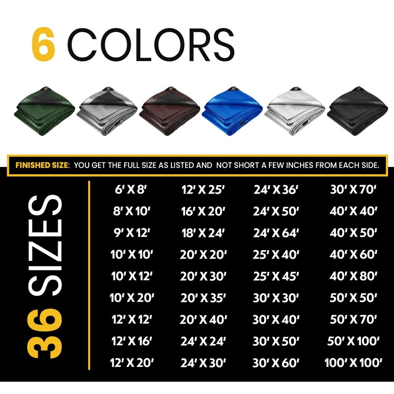 - FINISHED SIZE: PROTARP sizing for the tarps are finished size which means when you choose your size you get the full size tarps and it’s not short a few inches from both sides like other companies.