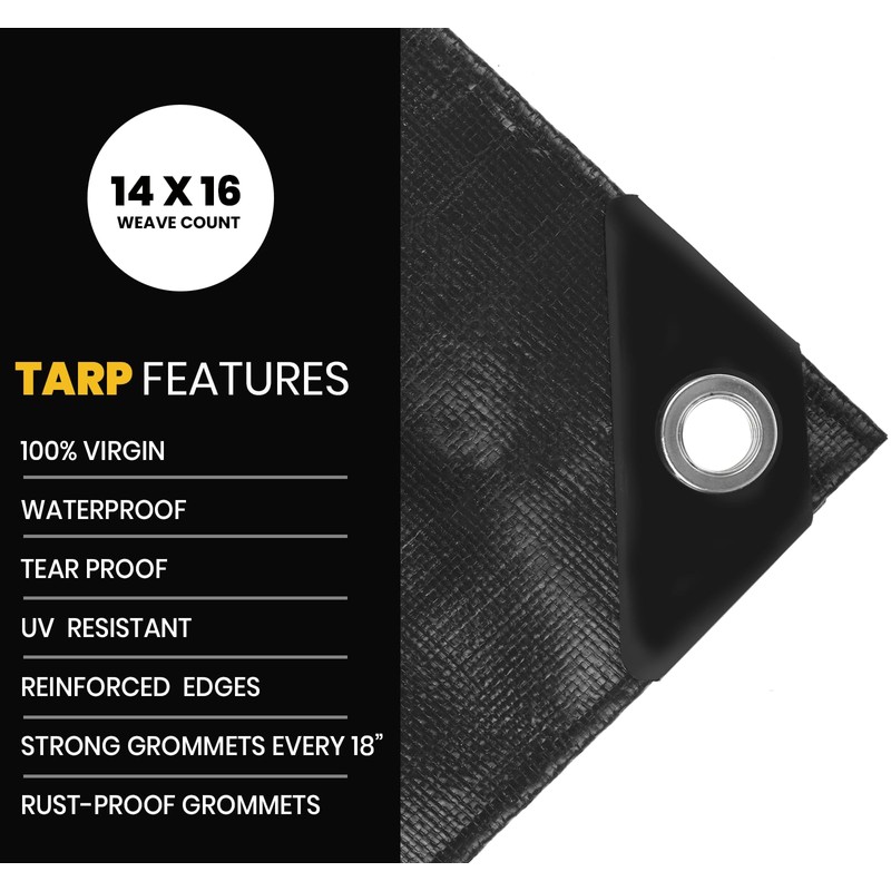- STRONG GROMMETS & REINFORCED EDGES: The protective tarp has a 14 x 16 weave count, reinforced edges and metal grommets every 18 inches. The tear-resistant material is super durable while the metal grommets allow you to tie down the tarpaulin cover easily, using bungee cords or a strong rope.