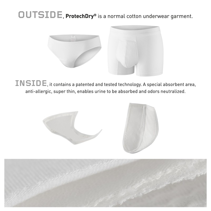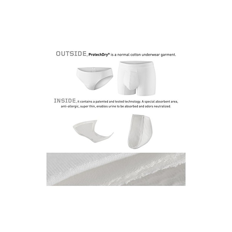 ProtechDry is a cotton underwear with a FRONT ONLY incorporated textile absorbent area, (NO OPENING) made of a patented multi-functional fabric. It is especially recommended for occurrences of light urinary incontinence (urine losses of up to 90ml/day = 3.04 OZ = 18.25 teaspoon) Product Composition: 95% Cotton + 5% Elastane (except in absorbing area). PLEASE CHECK YOUR SIZE