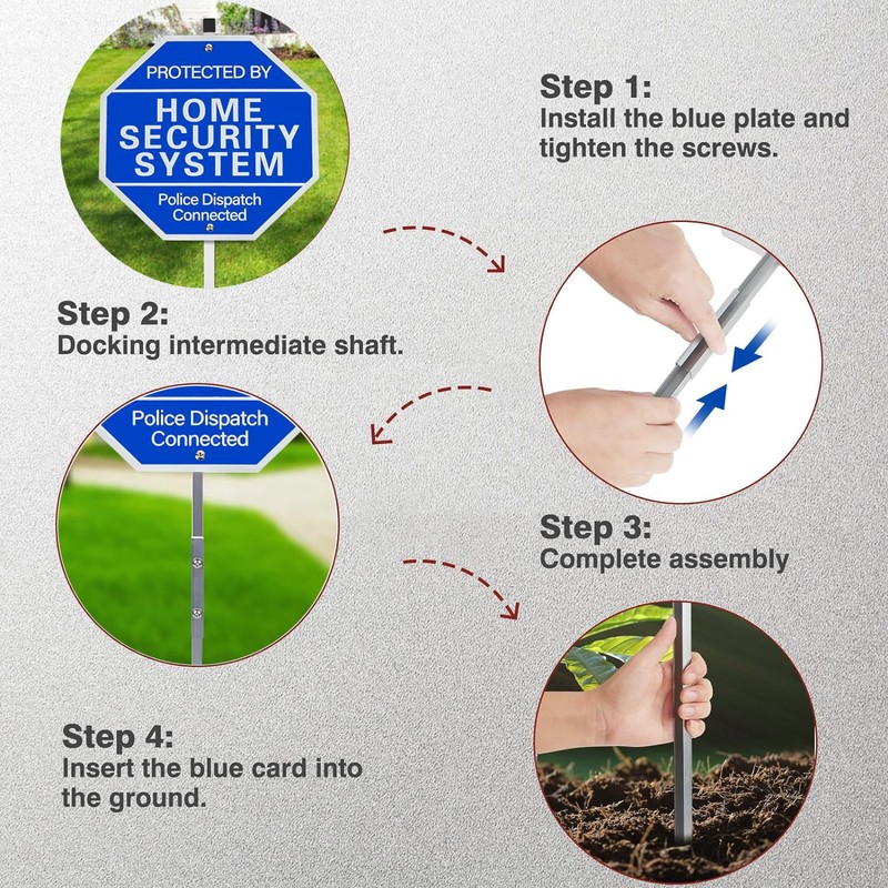 • Easy installation with included stakes & screws - mount on walls, fences, wreaths or add ground stake.Make sure you have both pieces: the top yard sign with pole attached and the bottom stake.Simply insert it into the ground, and your warning yard sign is ready to go.