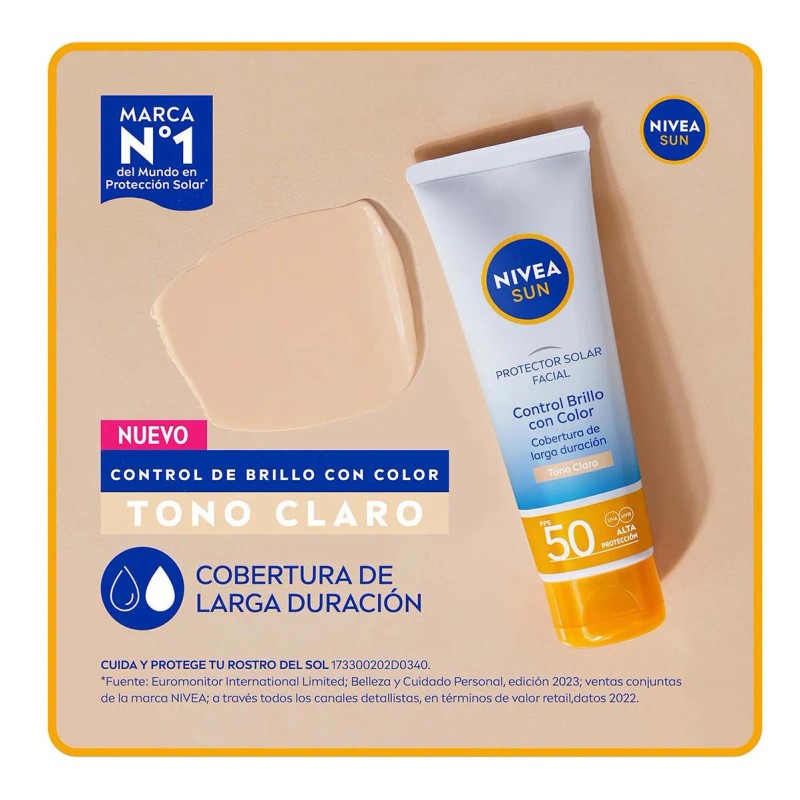 La piel del rostro merece una protección especial, y NIVEA SUN lo hace posible con su protector solar facial Control De Brillo Tono Claro FPS 50. Esta fórmula innovadora proporciona una protección solar inmediata y eficaz, mientras hidrata la piel y proporciona un tono uniforme gracias a sus pigmentos teñidos. ¡Disfruta tu día, NIVEA SUN protege tu rostro!