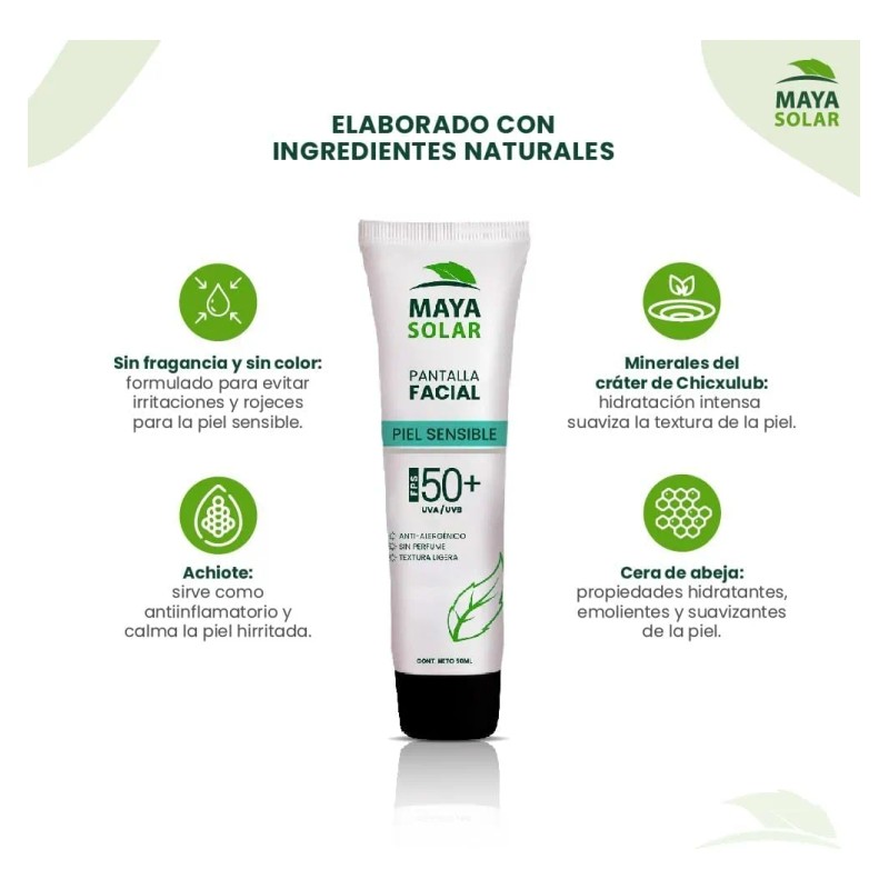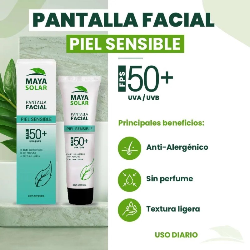 Dale a tu piel la protección que se merece con el Protector Solar Facial Maya Solar para Piel Sensible de 50 ml. Este bloqueador en crema ha sido especialmente formulado para pieles sensibles, ofreciendo una avanzada protección FPS 50 contra los dañinos rayos UVA/UVB. Su fórmula vegana, libre de parabenos y sin aroma combate el brillo, dejando tu piel suave y con un acabado mate, sin sensación grasosa. De textura ligera y fluida, se absorbe rápidamente y ayuda a prevenir los signos del envejecimiento y la irritación solar. Es hipoalergénico y resistente al agua, perfecto para uso diario desde los 6 meses, manteniendo una piel joven y radiante.