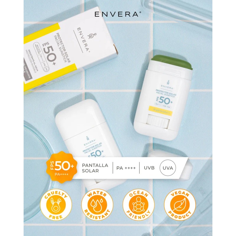 Protector solar facial y corporal Envera 3 en 1: FPS 50+ UVA/UVB Unisex 15gr invisible humectante antioxidantes bloqueador solar en barra hipoalergénico