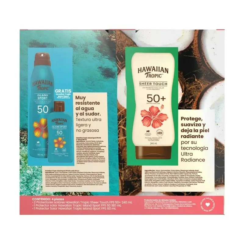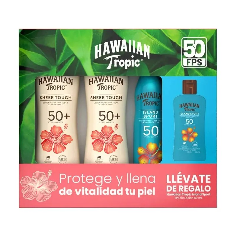 Este pack de protector solar Hawaiian Tropic con SPF 50 combina las variantes Sheer Touch e Island Sport para ofrecer una protección efectiva y de calidad contra el sol. Su textura ultraligera y no grasa se absorbe rápidamente, dejando la piel suave, luminosa y sin sensación pegajosa ni pastosa, gracias a la tecnología ULTRA RADIANCE. Es resistente al agua y al sudor, lo que lo hace perfecto para actividades al aire libre. La fórmula es hipoalergénica, sin parabenos, sin aceites, Cruelty-free y dermatológicamente probada, adecuada para todo tipo de piel, incluyendo la infantil (desde 6 años). Disfruta de una protección duradera con un agradable aroma.