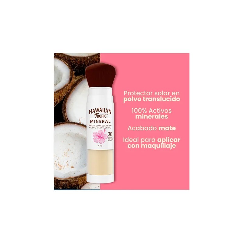 Hawaiian Tropic Mineral Brush es una nueva forma práctica y conveniente de aplicar y reaplicar tu SPF a lo largo del día, ¡Para que tu piel pueda obtener la protección diaria que necesita y al mismo tiempo mejorar su apariencia! Elaborado con minerales de origen natural para absorber el exceso de grasa en el rostro, este formato de brocha portátil, es fácil de usar y se adapta a la perfección a su rutina diaria de belleza, puede usarse solo, debajo del maquillaje, o incluso después de aplicarlo para ayudar a fijarlo. La fórmula translúcida se mezcla con la piel para brindar un hermoso acabado mate, mientras que sus activos 100 % minerales ofrecen protección UVA/UVB de amplio espectro sin filtros químicos.