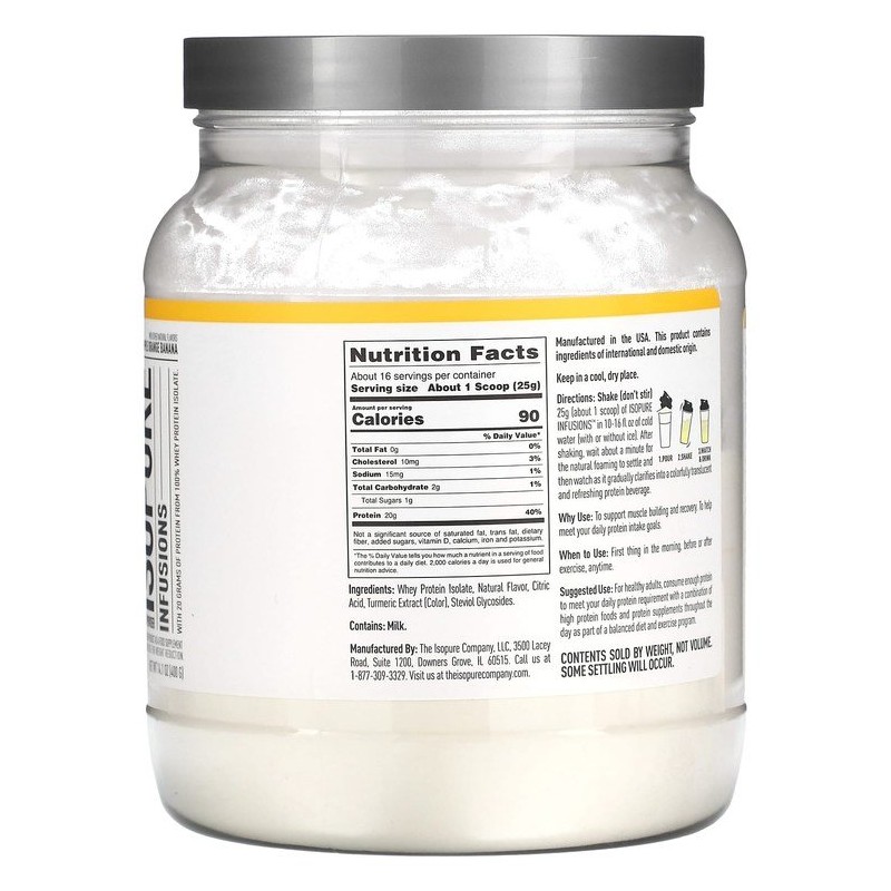 Shake (don't stir) 25g (about 1 scoop) of ISOPURE INFUSIONS™ in 10-16 fl oz of cold water (with or without ice). After shaking, wait about a minute for the natural foaming to settle and then watch as it gradually clarifies into a colorfully translucent and refreshing protein beverage.