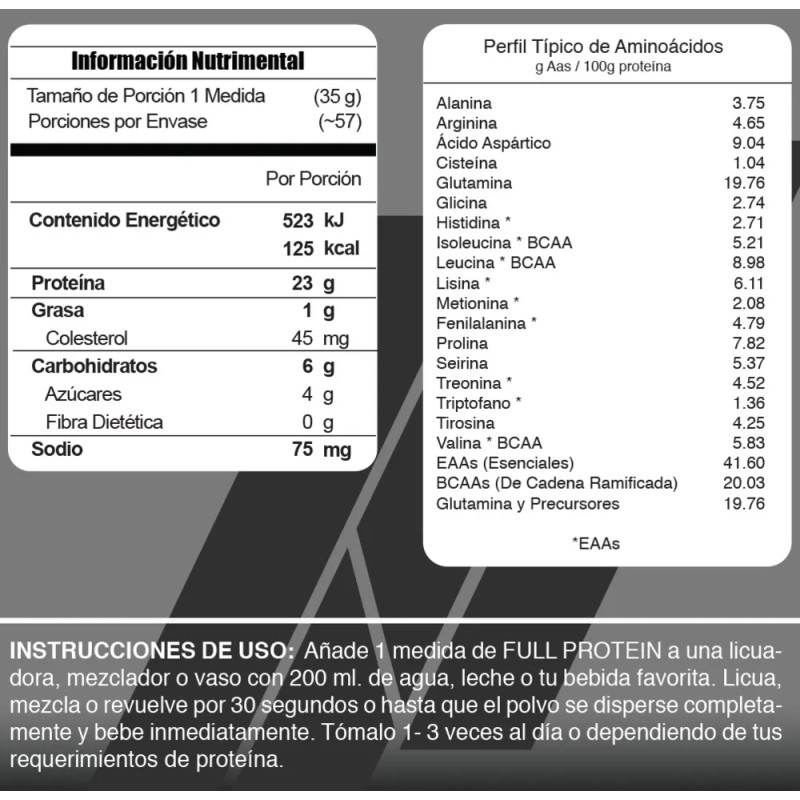 Full Protein es la fórmula de liberación sostenida diseñada con la combinación exacta de proteína de distintas fuentes para brindarte una absorción de aminoácidos necesaria para un máximo crecimiento muscular, una óptima recuperación y la prevención de la pérdida muscular.