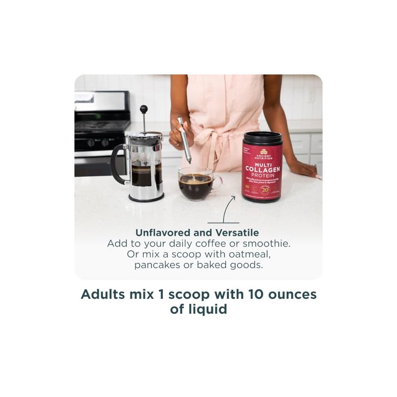 - La galardonada Proteína Multi colágeno de Ancient Nutrition ofrece resultados rápidos que perduran beneficios rápidos, continuos y persistentes. Repleto de 5 tipos (I, II, III, V, X) y cuatro fuentes diferentes de colágeno e ingredientes clínicamente estudiados, la Proteína Multi Colágeno de Ancient Nutrition es actualmente el único producto en el mercado con su ingrediente fermentado de colágeno que cuenta con estudios clínicos humanos que muestran la eficacia de los beneficios. El ingrediente fermentado de colágeno en Multi Colágeno Proteína le dará resultados notables a partir del primer día. Vamos a afrontarlo. Cuando inicias un régimen de salud, quieres ver resultados rápidamente, y la proteína de colágeno múltiple de Ancient Nutrition ofrece. Este suplemento de salud con colágeno de bovino, pollo, pescado y membrana de cáscara de huevo te da resultados para tu cabello, piel, uñas, articulaciones y intestino. Eso no es todo, sin embargo, hemos añadido un potenciador de colágeno patentado clínicamente estudiado. Esta vitamina C atrae a nuestras células como un imán y tiene capacidad de absorción y antioxidante. Incluir este ingrediente de vitamina C en nuestra formulación le proporciona poderosas propiedades antioxidantes y beneficios para la salud de ayudar a apoyar el proceso de síntesis de colágeno. En Ancient Nutrition nos enorgullecemos de proporcionar productos de la más alta calidad, y los probamos rigurosamente para la pureza y potencia para garantizar que recibes productos de fuentes limpias y confiables. Simplemente saca y disfruta de tu café, té, batidos, sopas, productos horneados y mucho más. Esta fórmula completa de colágeno está hecha sin lácteos, soja, granos y gluten puede ayudarle a apoyarle en su viaje de salud y obtener los resultados que está buscando para comenzar en el primer día. Actúe ahora, y vea por qué Multi Colágeno Proteína es un colágeno galardonado que miles han crecido hasta amar!