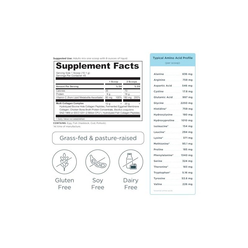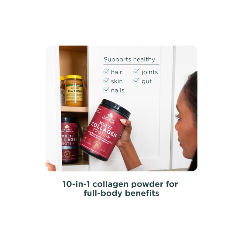 • La galardonada Proteína Multi colágeno de Ancient Nutrition ofrece resultados rápidos que perduran beneficios rápidos, continuos y persistentes. Repleto de 5 tipos (I, II, III, V, X) y cuatro fuentes diferentes de colágeno e ingredientes clínicamente estudiados, la Proteína Multi Colágeno de Ancient Nutrition es actualmente el único producto en el mercado con su ingrediente fermentado de colágeno que cuenta con estudios clínicos humanos que muestran la eficacia de los beneficios. El ingrediente fermentado de colágeno en Multi Colágeno Proteína le dará resultados notables a partir del primer día. Vamos a afrontarlo. Cuando inicias un régimen de salud, quieres ver resultados rápidamente, y la proteína de colágeno múltiple de Ancient Nutrition ofrece. Este suplemento de salud con colágeno de bovino, pollo, pescado y membrana de cáscara de huevo te da resultados para tu cabello, piel, uñas, articulaciones y intestino. Eso no es todo, sin embargo, hemos añadido un potenciador de colágeno patentado clínicamente estudiado. Esta vitamina C atrae a nuestras células como un imán y tiene capacidad de absorción y antioxidante. Incluir este ingrediente de vitamina C en nuestra formulación le proporciona poderosas propiedades antioxidantes y beneficios para la salud de ayudar a apoyar el proceso de síntesis de colágeno. En Ancient Nutrition nos enorgullecemos de proporcionar productos de la más alta calidad, y los probamos rigurosamente para la pureza y potencia para garantizar que recibes productos de fuentes limpias y confiables. Simplemente saca y disfruta de tu café, té, batidos, sopas, productos horneados y mucho más. Esta fórmula completa de colágeno está hecha sin lácteos, soja, granos y gluten puede ayudarle a apoyarle en su viaje de salud y obtener los resultados que está buscando para comenzar en el primer día. Actúe ahora, y vea por qué Multi Colágeno Proteína es un colágeno galardonado que miles han crecido hasta amar!