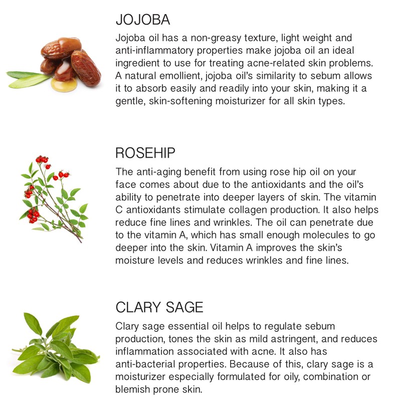 - Clarify + Hydrate in one step. This facial is made with naturally sourced Jojoba, Rosehip and Clary Sage Oil.