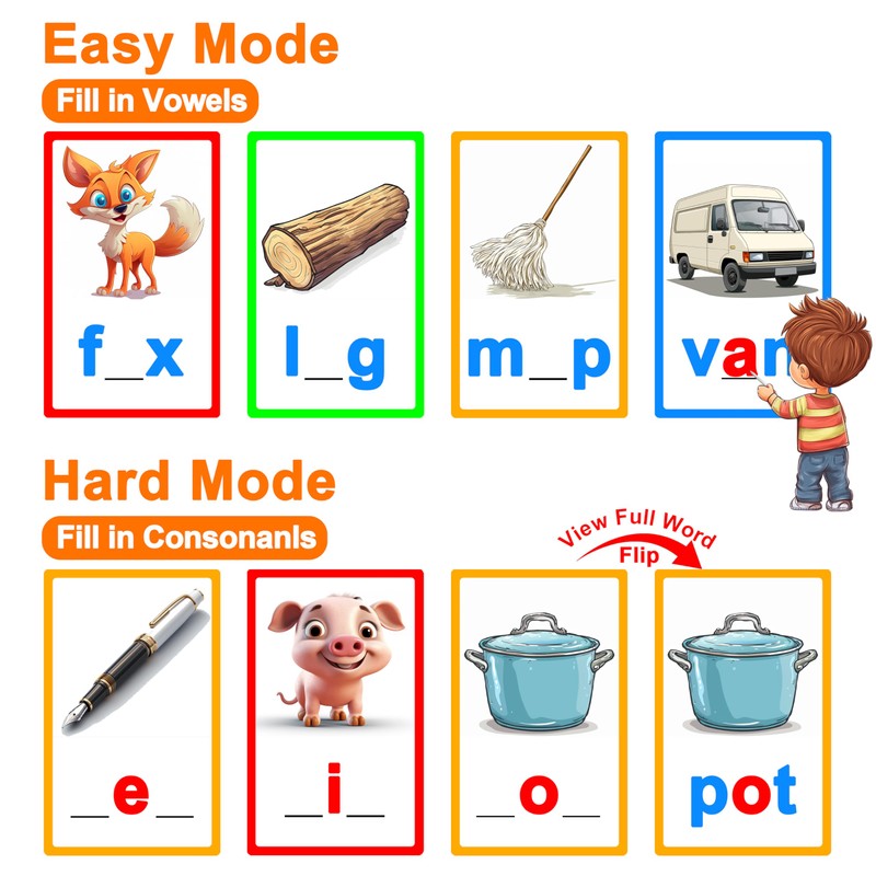 - Dual-Sided Flash Cards: Each card displays colorful patterns and CVC words, with one side showing the full word and the reverse challenging children to fill in missing letters using the included dry-erase pens.