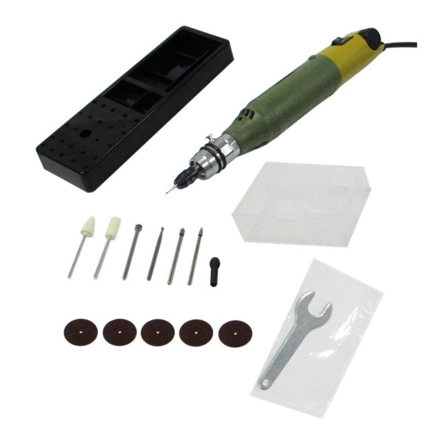 Lightweight and compact electric glider with a variety of tip tools. This machine is a 100 volt model that can be used with household power supplies. Product Size: Length: 1.4 inches (35 mm), Width: 1.4 inches (35 mm), Height: 9.1 inches (230 mm); Product Weight: 9.2 oz (260 g); Package Size: Length: 12.2 inches (310 mm), Width: 67.7 inches (170 mm), Height: 2.5 inches (64 mm); Package Weight: 18,00000000000000000000000 mm); Country of Origin: min-1 lbs (1 mm). Set Contents: Main unit, spanner. For collet chuck diameter 0.09 inch (2.35 mm) (attached to the body), 1 diamond bit, 2 types of GC whetstones with shaft, 2 types of pure hair buff with shaft, 1 piece of high swivel, 5 pieces of cutting stone, 1 dedicated arbor shaft, 1 dedicated bit case, 1 tool stand; Product dimensions: length 9.1 inches (230 inches (235 mm); Weight: 9 inches (235 mm); Weight: 9 oz (235 minutes; Uses: glass engraving, carving, carving, carving, carving, metal Carving, polishing, polishing Cutting / grinding / rust removal