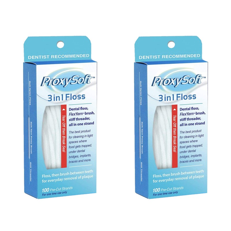 ProxySoft 3-in-1 Dental Floss for Optimal Teeth Flossing- 2 Packs Pre-Cut Ortho Floss Threaders for Braces, Tight Spaces, Bridges, Implants with Built-in Soft Proxy Brush and Stiff Threader Flosser | Proxysoft