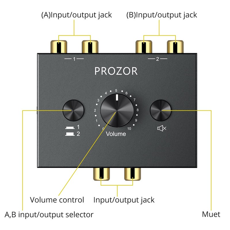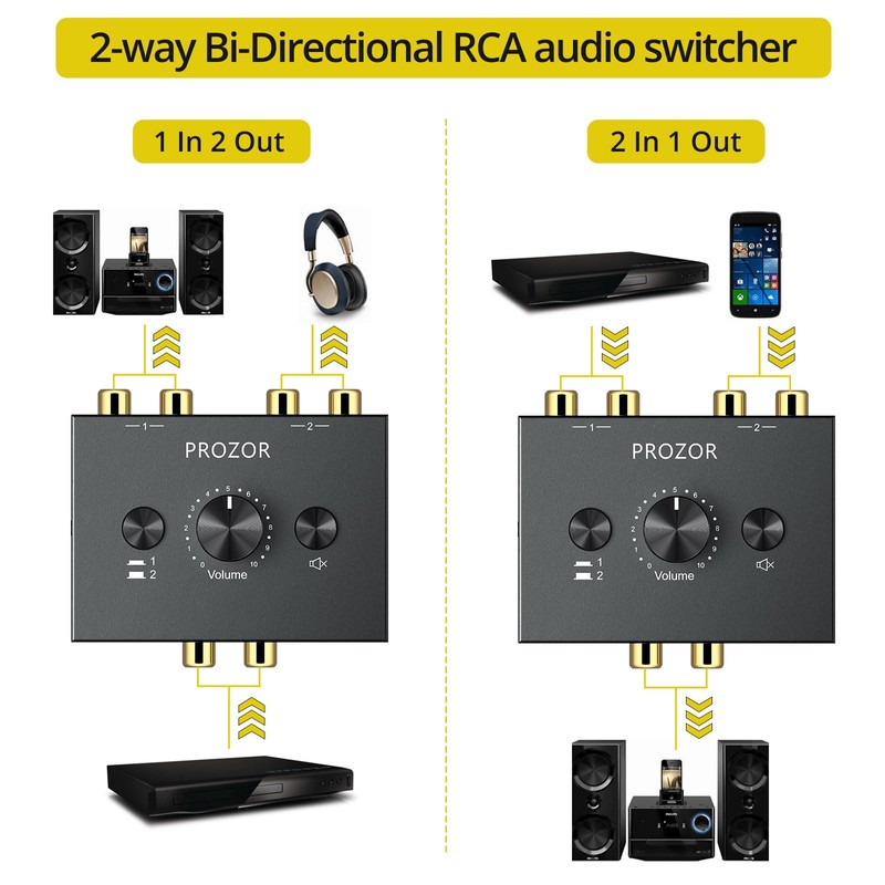 PROZOR RCA Audio Switcher 2(1)-In-1(2)-Out Bidirectional RCA Speaker Switch Box RCA Switcher with Volume Control Mute Button and No External Power Required
