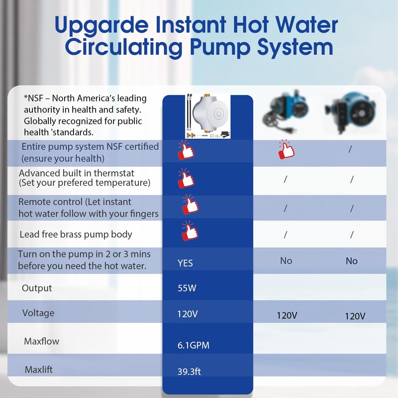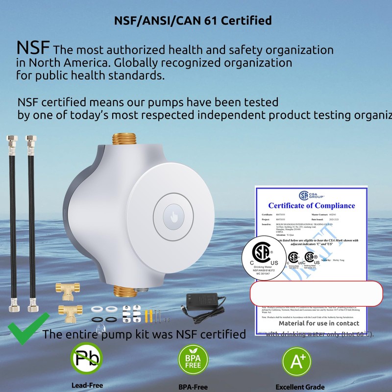 • ๐™‰๐™Ž๐™ ๐˜พ๐™š๐™ง๐™ฉ๐™ž๐™›๐™ž๐™š๐™™ ๐™›๐™ค๐™ง ๐™Ž๐™–๐™›๐™š๐™ฉ๐™ฎ: NSF - The most authorized health and safety organization in North America. Globally recognized organization for public health standards. Our Smart Instant Hot Water Recirculating Pump has achieved NSF certification, guaranteeing superior safety and health standards. Trust in our pump to meet industry benchmarks, providing reliable performance. With a commitment to quality, it ensures a seamless and health-conscious solution for instant hot water. Choose excellence in every aspect with our NSF certified recirculating pump.
