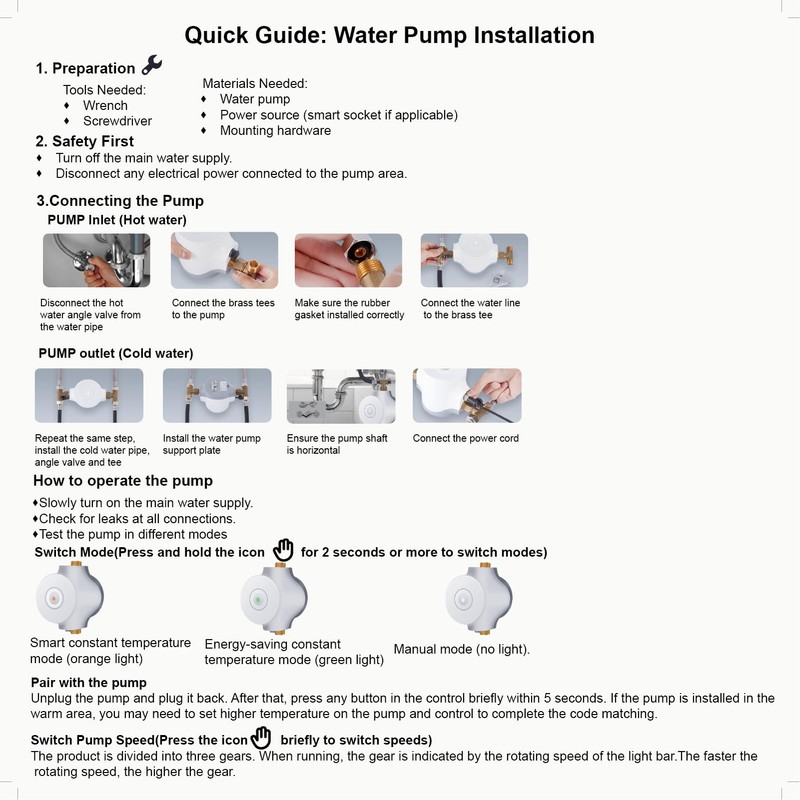 • [Smart Pump Features] Our pump offers three modes: Smart Mode for instant hot water, Energy-Saving Mode to lower temperature if unused, and Manual Mode to start a few minutes before use for maximum savings. The smart memory function remembers settings when powered off, and there are three adjustable speeds.