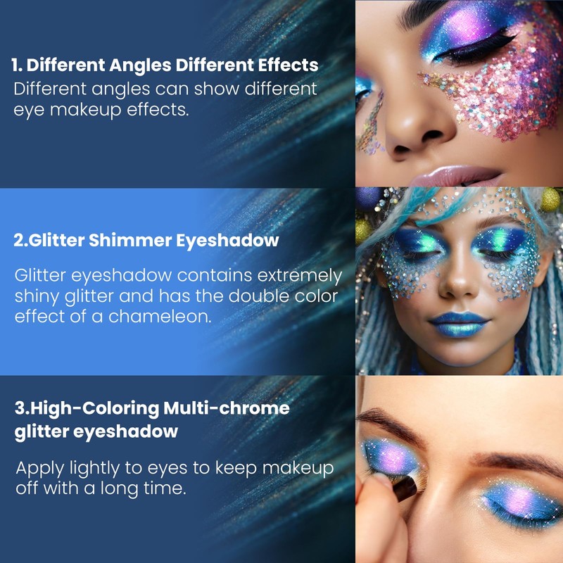 - Spezielles Festival-Make-up: Die Multichrom-Glitzer-Lidschatten-Palette ist ein Muss für große Festivals, Chamäleon-Lidschatten kann effektiv die ideale Vielfalt an Looks kreieren; Partys, Hochzeiten, Geburtstage, Weihnachts-Make-up, Halloween-Make-up, Thanksgiving und andere besondere Anlässe eignen sich sehr gut für den Einsatz. Egal wo Sie sind, Sie stehen im Mittelpunkt der Menge.