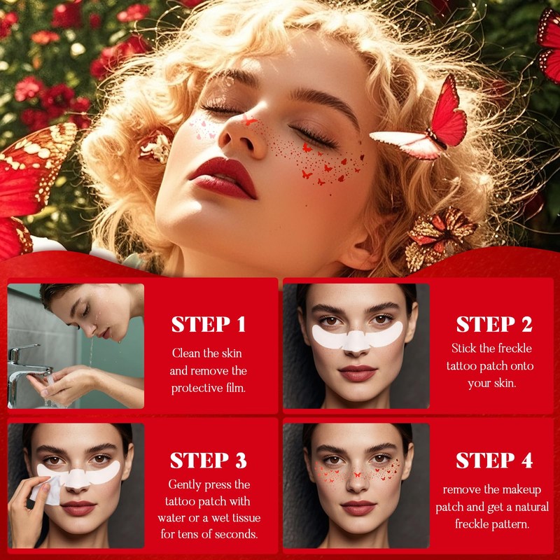 - EASY TO USE: Firstly, remove the plastic paper on the back. Then, stick the freckle tattoo patch tightly onto your skin. Gently press the tattoo patch with water or a wet tissue for tens of seconds. After that, remove the makeup patch and you will get a natural butterfly freckle pattern.