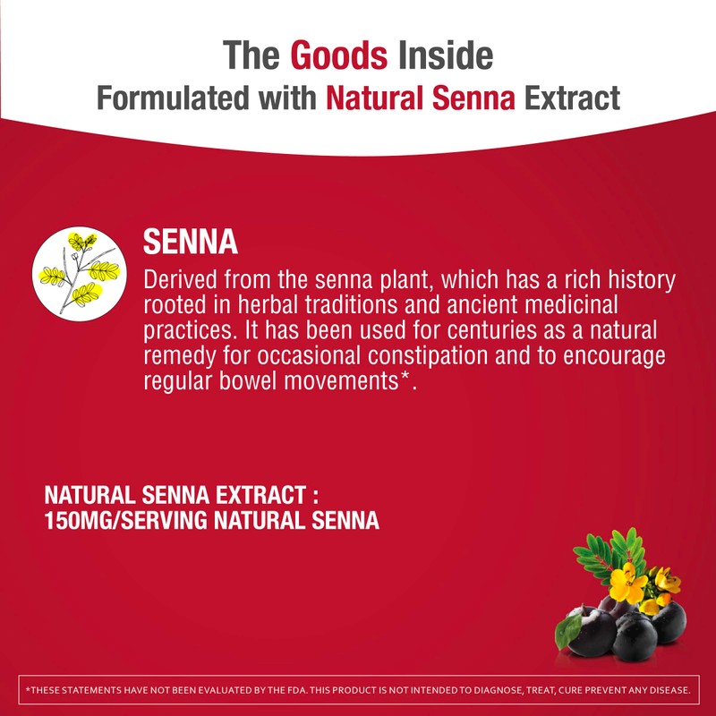 - Active Ingredients: Prunes extract, Cassia angustifolia vahl, Cassia senna L. Inactive Ingredients: Sodium Starch Glycolate, Polyvinylpyrrolidone, Copolyvidone, Opadry NS Clear (Coating), Colloidal Silicon Dioxide, Sodium Lauryl Sulphate.