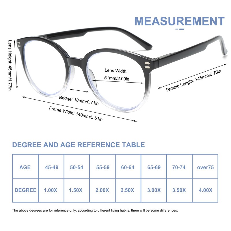 - BLUE LIGHT BLOCKING READING GLASSES: Reading glasses for women men with high definition blue light blocking lens makes the vision clear and scratch resistant. The stylish eyewear round frame design fits most face shapes and more accurate magnifications (1.00, 1.25, 1.50, 1.75, 2.00, 2.25, 2.50, 2.75, 3.00, 3.50) to fit your needs.