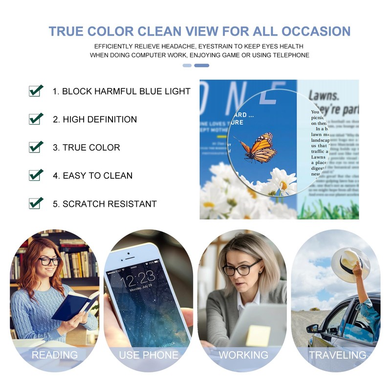 Anti-blue light function: Anti harmful blue ray, provide all-day protection, against the detrimental effect high energy visible blue light;