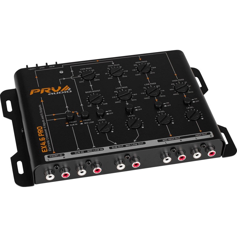 PRV Audio's EX4.6 PRO electronic crossover gives you tons of flexibility to make it easy to tune your car audio system for optimum sound. With 4-way adjustable high and low pass filters and also output level control on each channel this crossover gives you a wide variety of adjustments for most situations. To get maximum power and impact from your system the EX4.6 PRO also includes an 0-12 dB bass boost at 45 Hz on the subwoofer output