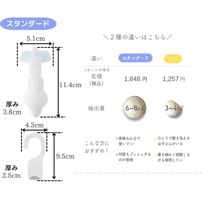 No more troublesome refills. Simply set the refill pack and you're ready to go. Can be used to attach to refill packs such as shampoo rinse. Check valve construction prevents air back flow and prevents oxidation. Vacuum preservation prevents bacterial growth. Hang and use detergent until the last end. ■ Features: Simply set the holder and pump into the refill pack and use it as is. Since there is no troublesome refill, you can use it as is. Eliminates the need for a bottle to keep your bathroom clean. No need to refill (wash, dry, refill). Easy one-touch installation and removal. The perfect amount can be extracted with one hand, making it convenient when bathing with babies. ■How to use (1) Cut the exit of the refill pack to a width of 0.6 - 0.8 inches (1.5 - 2 cm). (2) Insert the pump with the lever open to the base. (3) Close the lever and lock it in place. (4) Simply pull the slider of the holder forward, hold the end of the refill pack and press the slider again to secure and hang. (5) Press the pump to use. ■ How to install the pump: Regular pack should be cut off the outlet before installing it. If the exit is a pipe shape, do not cut it off and cut the other side with scissors. (Opening dimensions: 0.6 - 0.8 inches (15 - 20 mm)); *Please insert the cut side neatly into the base of the clip. If the exit of the refill pack is a screw type, remove the clip part from the pump and attach the pump directly to the screw. If the screws do not fit, keep the lid tightened and cut the other side with scissors. There may be cases where the refill pack has an opening of 0.8 inches (20 mm) or a special shape of the refill pack. If liquid leaks during use, please reset the pump according to the instructions above.