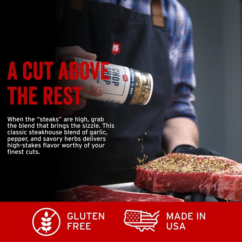 - When the "steaks" are high, reach for the good stuff. Our Chop Shop Steak and Chop seasoning is a butcher-approved garlic spice & herb blend, packed with the best steak seasoning flavors to level up your grilling game.