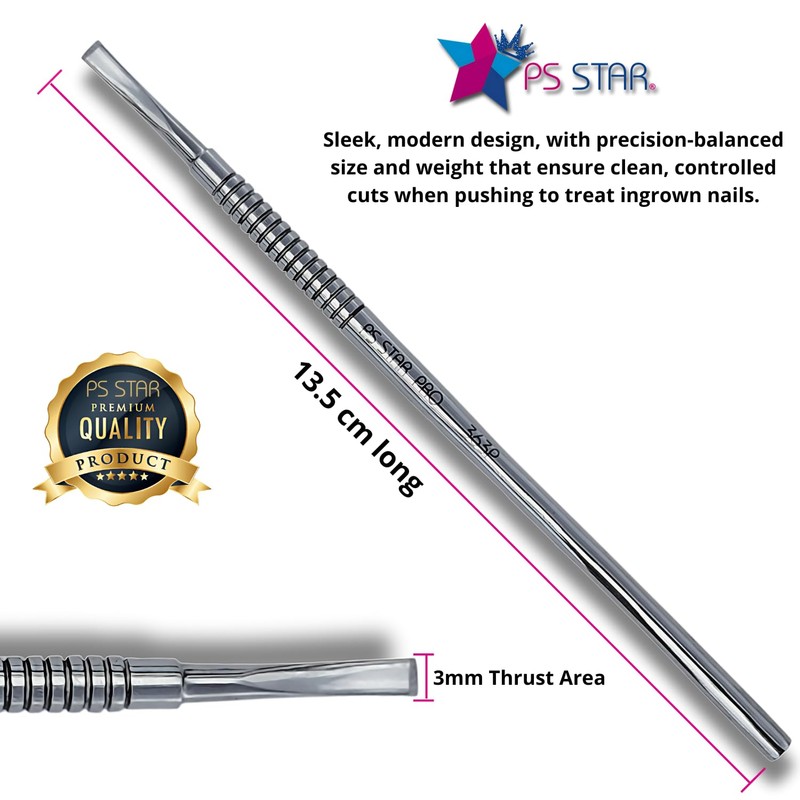 GUIDE - CUTTER FOR INGROWN TOENAILS, PROFESSIONAL USE - MODEL PRO. New generation PRO. Guide - Cutter for ingrown nails, made of high performance stainless steel with COBALT alloy, recommended for use in Pedicure, excellent for the continuation and guidance of the cut in ingrown nails, will facilitate your work. Large and non-slip handle for excellent grip and comfort, sharp tip for nail cutting only when pushing, weight and size designed for the professional. After cutting the nail, it is recommended to use the extractor 360P or the curette 335P to remove the nail. Product designed to withstand wear and tear and to resist autoclave or chemical sterilization. Our new generation PRO, are designed for professionals, Made for you.