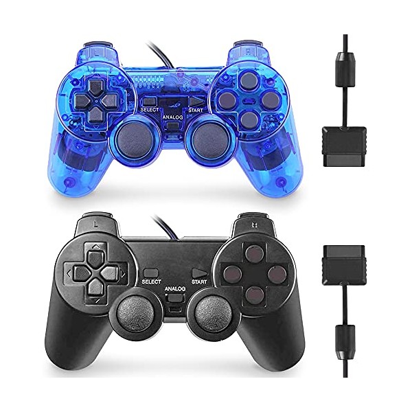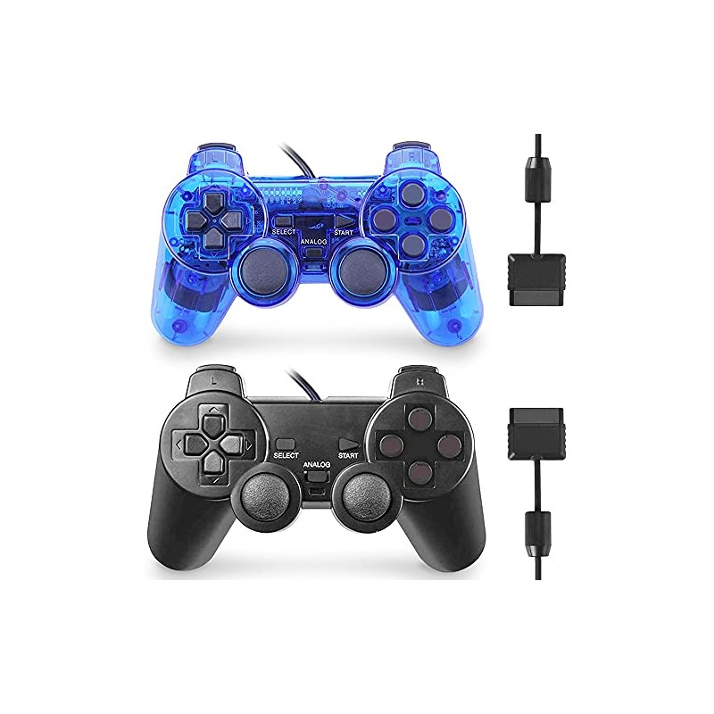 PS2 Controller Wired, 2 Pack Gamepad Remote Compatible with Play Station 2 Double Shock (Black and Clear Blue)