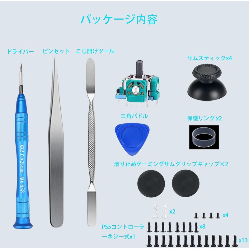 - Package Includes: 4 x 3D analog sticks, 4 x analog stick caps, 2 x protective rings, 2 x analog stick caps, 1 x PS5 controller screw, 1 x Phillips screwdriver, 1 x Tweezer kit, 1 x Spager, 1 x Triangle bottle opener