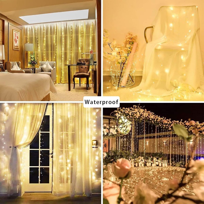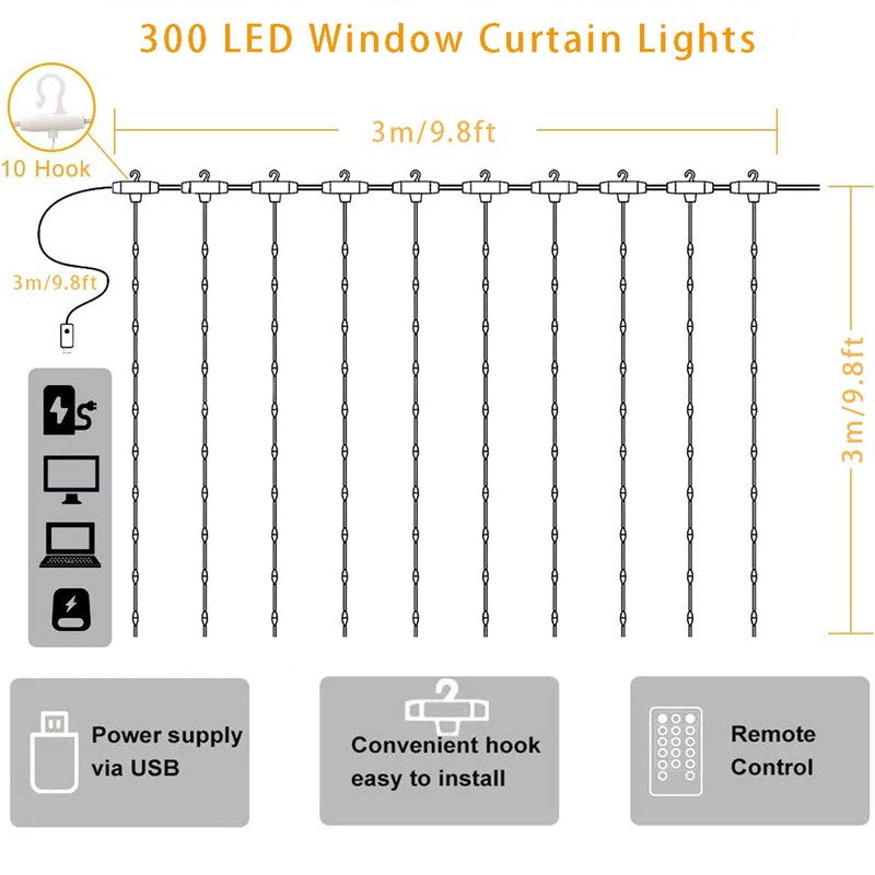 - 【3M x 3M Window Lights】These hanging window curtain lights equipped with 300 LED, 9.8ft x 9.8ft together with extra 9.8 ft long power cable and come with 10 hooks. It won't get overheated after long time using, you can touch it anytime. The LED light produces just the right amount of brightness that gives brilliant illumination without upsetting your eyes.