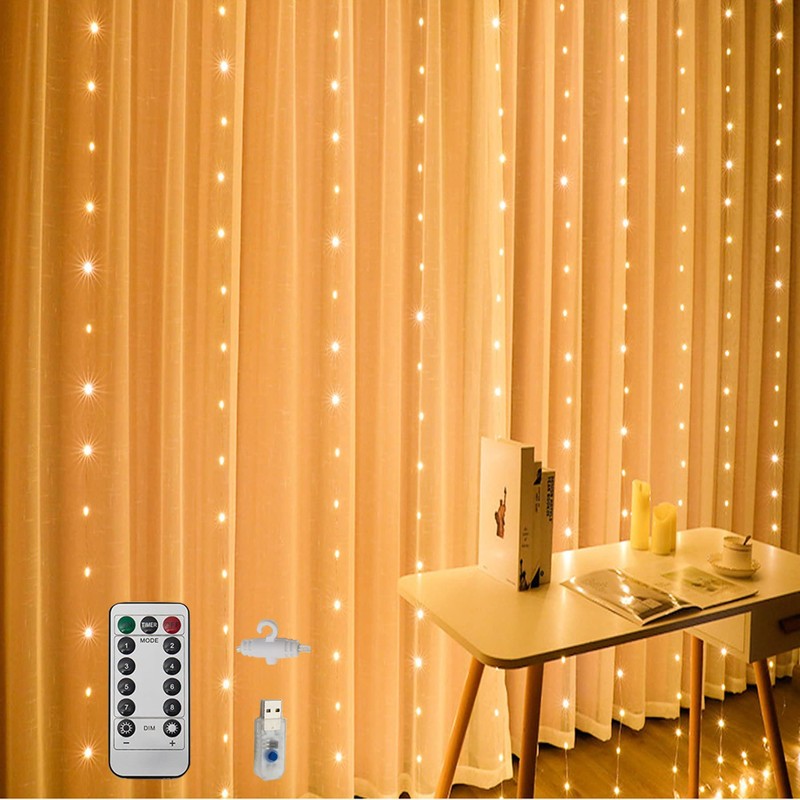 PSZJXGS Curtain Lights, Fairy Lights for Bedroom, 300 LEDs Warm White Twinkle Lights W/ 8 Modes USB Powered, Icicle String Lights W/Remote & Timer for Indoor Xmas Party Patio Decoration(9.8 x 9.8 Ft)