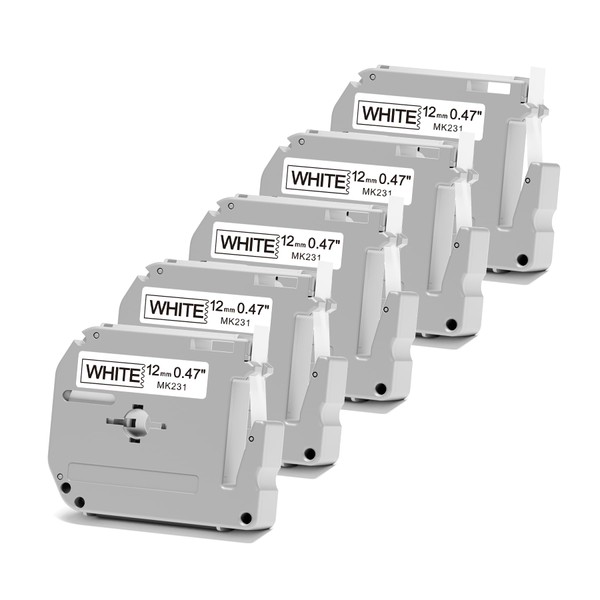 PT-M95 PT70BM PT-80 PT-65 PT-45 PT-90 PT-70 Label Maker Tape Replace for Brother P-Touch M-K231 Label Tape 12mm 0.47'' PTouch M Tape M-K231s MK231 EMK-231, 12mm x 8m White, 5 Packs