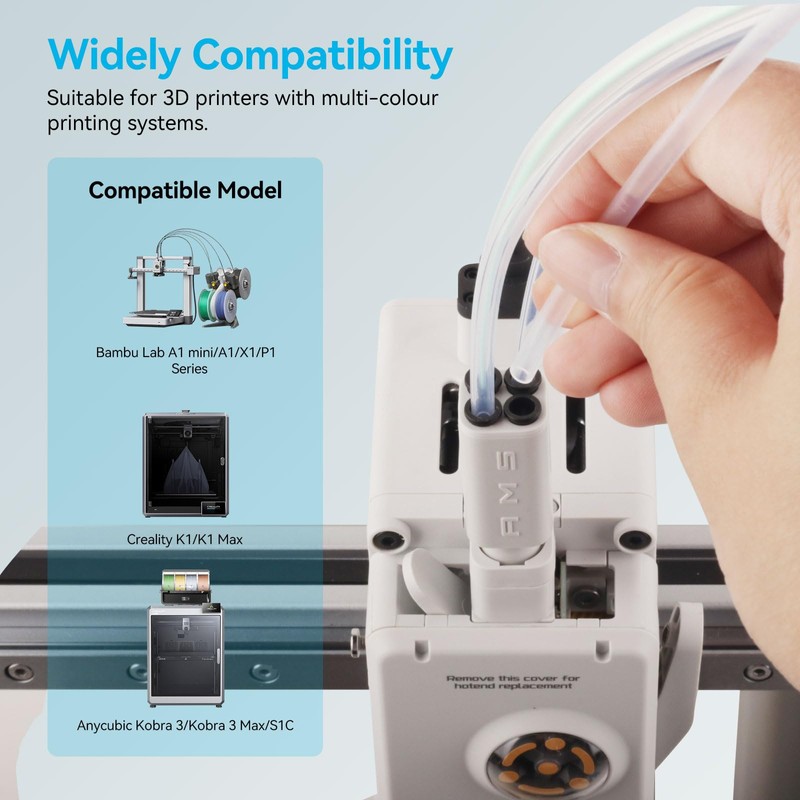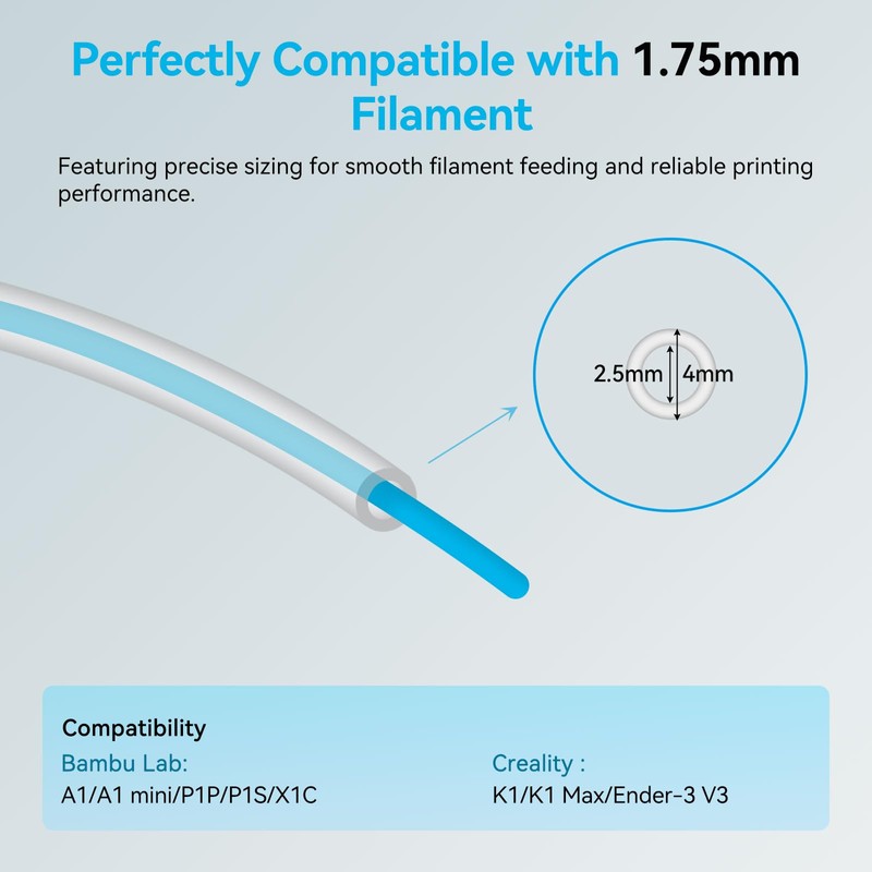 - 【Compatibility】This 2-meter PTFE Teflon tubing is compatible with direct-drive extruders, including the Bambu Lab A1, A1 Mini, P1P, P1S, and X1C, as well as the Creality K1, K1 Max, and Ender-3 V3. Its precise dimensions ensure smooth filament feeding and consistent printing results