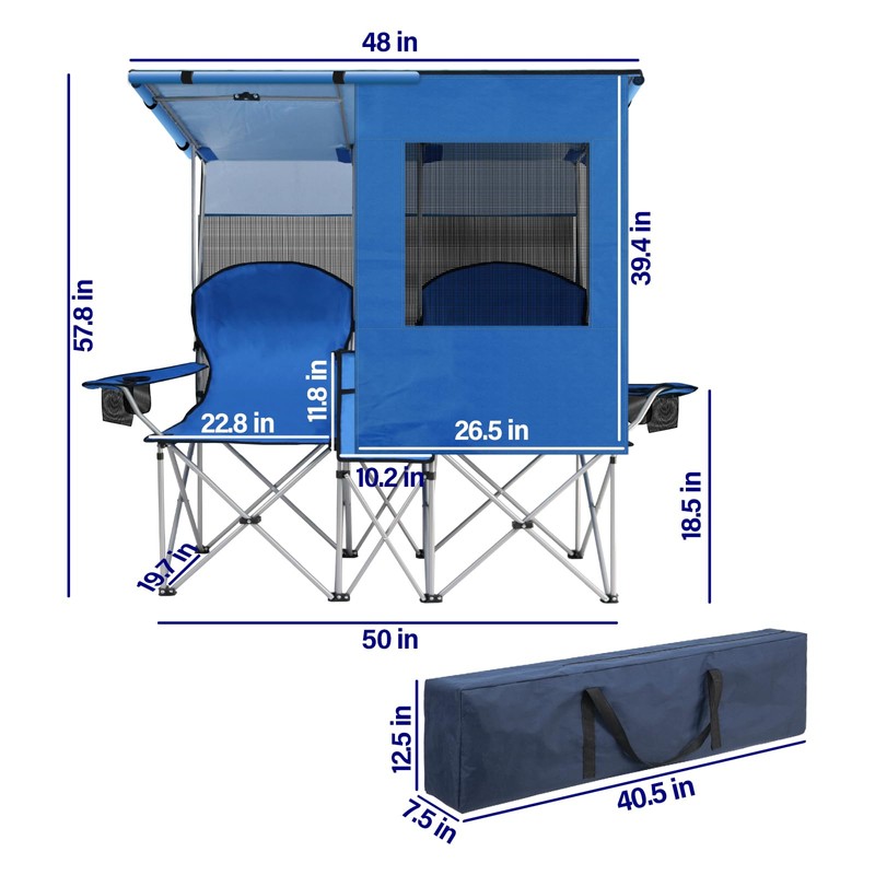ptlsy Double Camping Chair with Canopy, Folding Two-Person Seat, Portable Outdoor Loveseat with Shade, Folding Chairs for Beach, Lawn, and Outdoor Activities (Blue)
