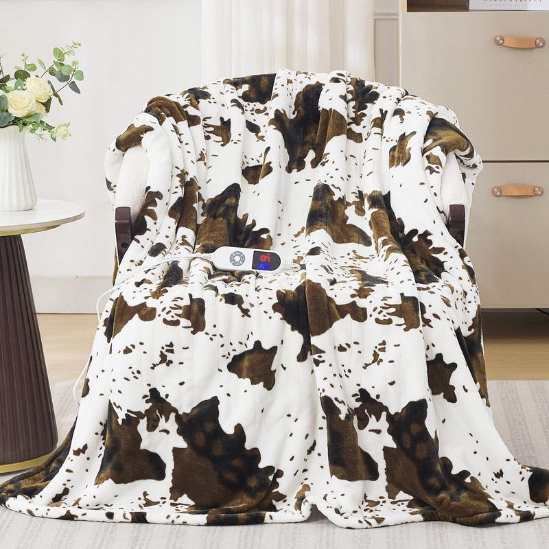 PTQ Brown Cow Print Heated Throw Blanket, Electric Blanket with 6 Heat Settings & 1-12H Timer, Cozy Soft Flannel Sherpa, Machine Washable, Warm Gift for Women, 50"x60"