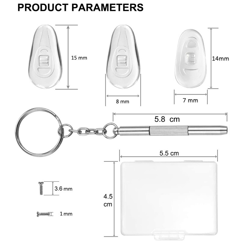 - The Eyeglass Repair Kit includes 5 sets of air chamber eyeglass nose pad and 2 sets of regular silicone nose pads, as well as 10 universal screws for the nose pads and a 3-in-1 micro screwdriver.