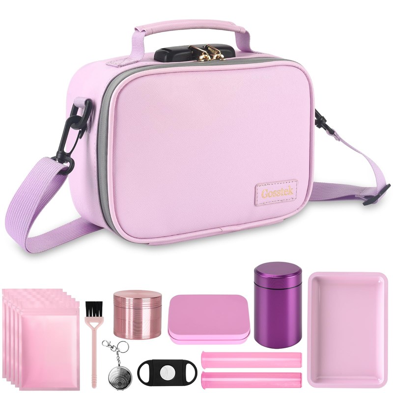 PU Leather Smell Proof Bag Kit with 9 Small Accessories, Portable Smell Proof Box Case with Lock and Great Gift for Women, Childproof Organization Container Box 8.8 X 7 X 4.1 Inches (Pink)
