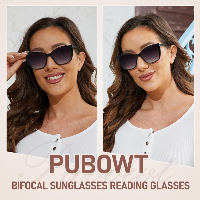 - OVERSIZED & FLEXIBLE & COMFORTABLE: PUBOWT trendy oversized cat-eye bifocal sunglasses reading glasses for women. Lightweight plastic frames with durable spring hinges, and metal round pins.