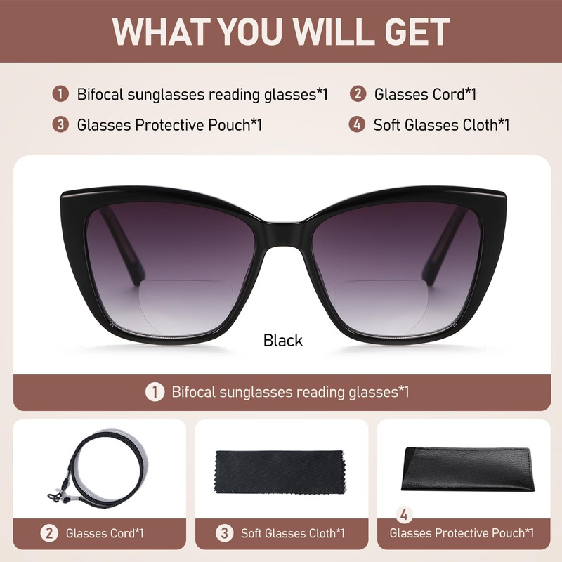 - PUBOWT SERVICE: You will receive 1 pair of black cat eye bifocal sunglasses reading glasses, 1 pair of pouches, 1 cleaning cloth, and 1 glasses cords. Enjoy a stylish, sunglasses reader's color look with worry-free service.