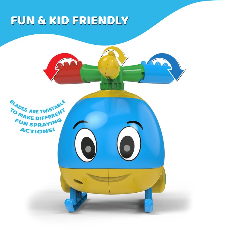 - ADORABLE DESIGN: Delight kids with this fun sprinkler toy right out of the box. This helicopter sprinkler has cheerful colors and a friendly face, ready to be your kids' best hot-weather buddy. The child-safe lightweight model is easy to move from place to place.