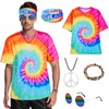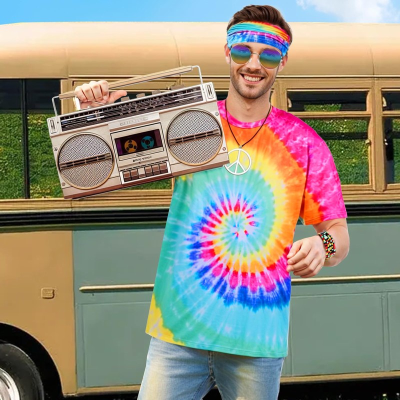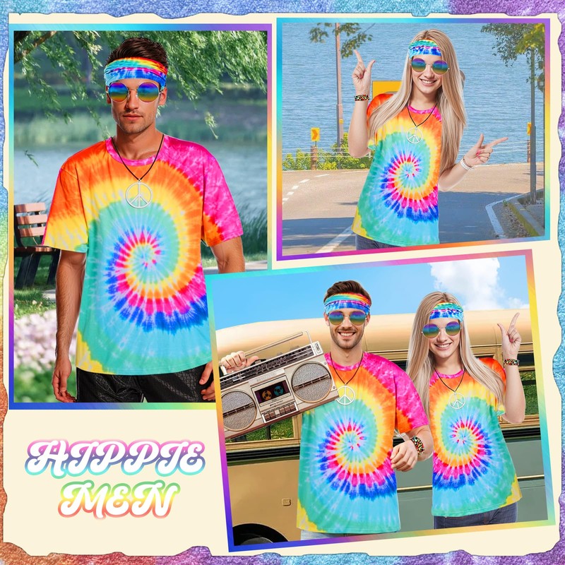 - 70s costumes for men and women: fun hippie combination with soft, comfortable tie-dye T-shirts. The retro rainbow color glasses are beautiful & generous. The versatile hippie handkerchiefs serve as a headband, hat, scarf or wrist. With peace chain perfect for holiday parties & gatherings. Shows individual style and good fashion taste