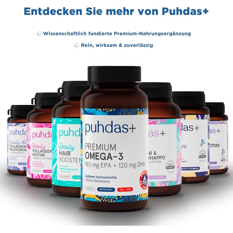 - Natural Omega 3 complex: puhdas+ Premium Omega-3 180 mg EPA + 120 mg DHA is a high-quality and certified fish oil. The product provides you with the fatty acids EPA and DHA in the same ratio as they occur in natural fish oil. The fatty acids are in their natural, easily absorbable triglyceride form. The production of puhdas+ Premium Omega-3 uses wild, small fish from the clean waters of the South Pacific