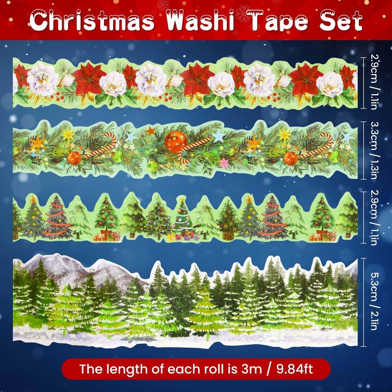 • Christmas Washi Tape Set: Package includes 4 rolls of holiday washi tape, 3 different widths, 29 mm / 1.14 in, 33 mm / 1.3 in, 53 mm / 2.1 in, each roll is 3m / 9.84 ft long. This set is a perfect addition to your holiday decorations and gift wrapping.