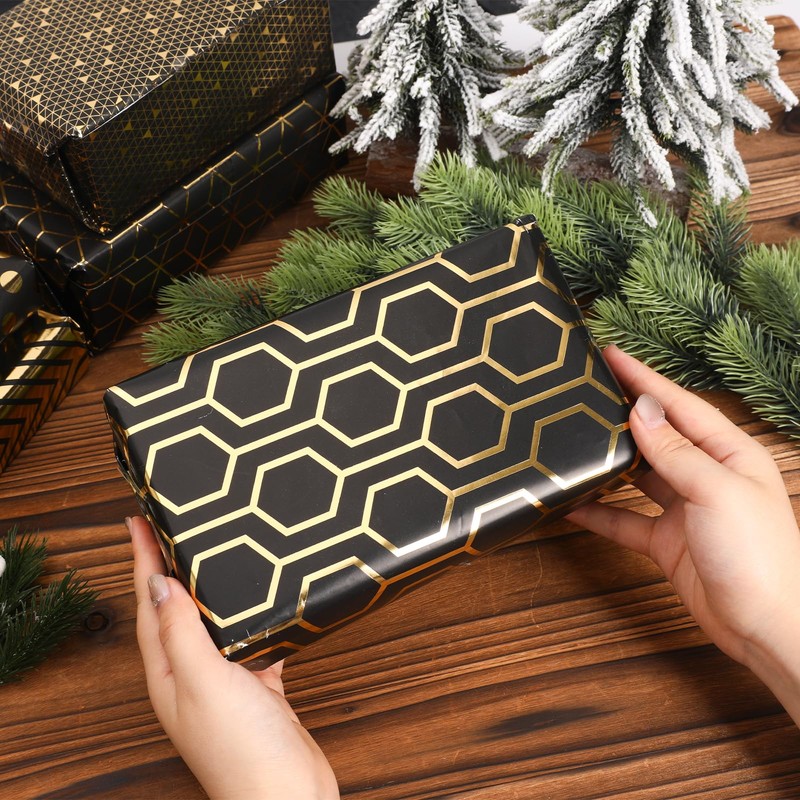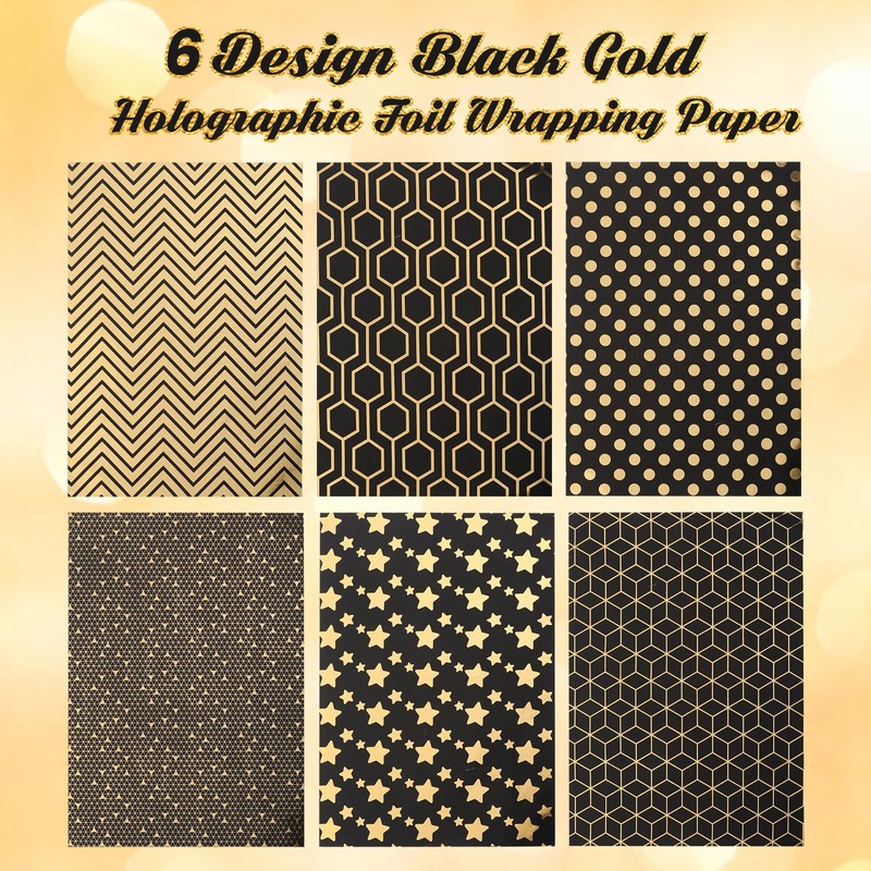 - HOLOGRAPHIC FOIL DESIGN: 6 sheets with 6 different black gold foil geometric patterns: plaid, polka dots, pentagram, wave, diamond, triangle. Holographic foil covers the surface with a metallic luster, making the gift more luxurious