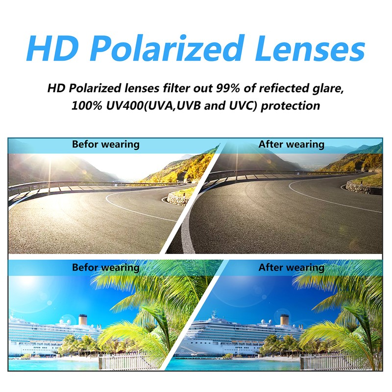 - ► TAC Polarized Sunglasses:All the sunglasses lens use 100% UV400 protection coating,can block 100% harmful UVA & UVB Rays.100% filtering Up to 400nm Harmful Blue Light. Restore true color, eliminate reflected light and scattered light,make the scenery more clear and soft and protect eyes perfectly.