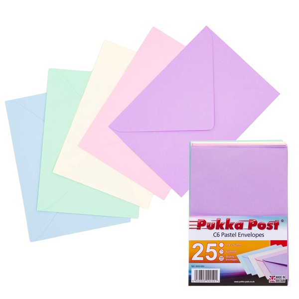 Pukka Pad, Pukka Post & Packaging Gummed Envelopes - Pack of 25, Ready-to-Seal, Durable 100GSM Postal Envelopes for Letters, Invitations, and Other Mail - 114 x 162mm, Size C6, Pastels
