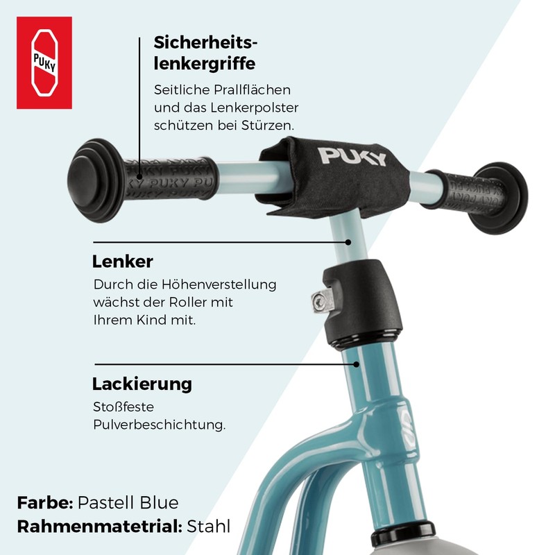 • Quality: trust Puky with the best conscience. Robust and durable ball bearings, shock-resistant powder coating and maintenance-free soft comfort tyres - look forward to high quality down to the smallest detail for kids up to 4 years.